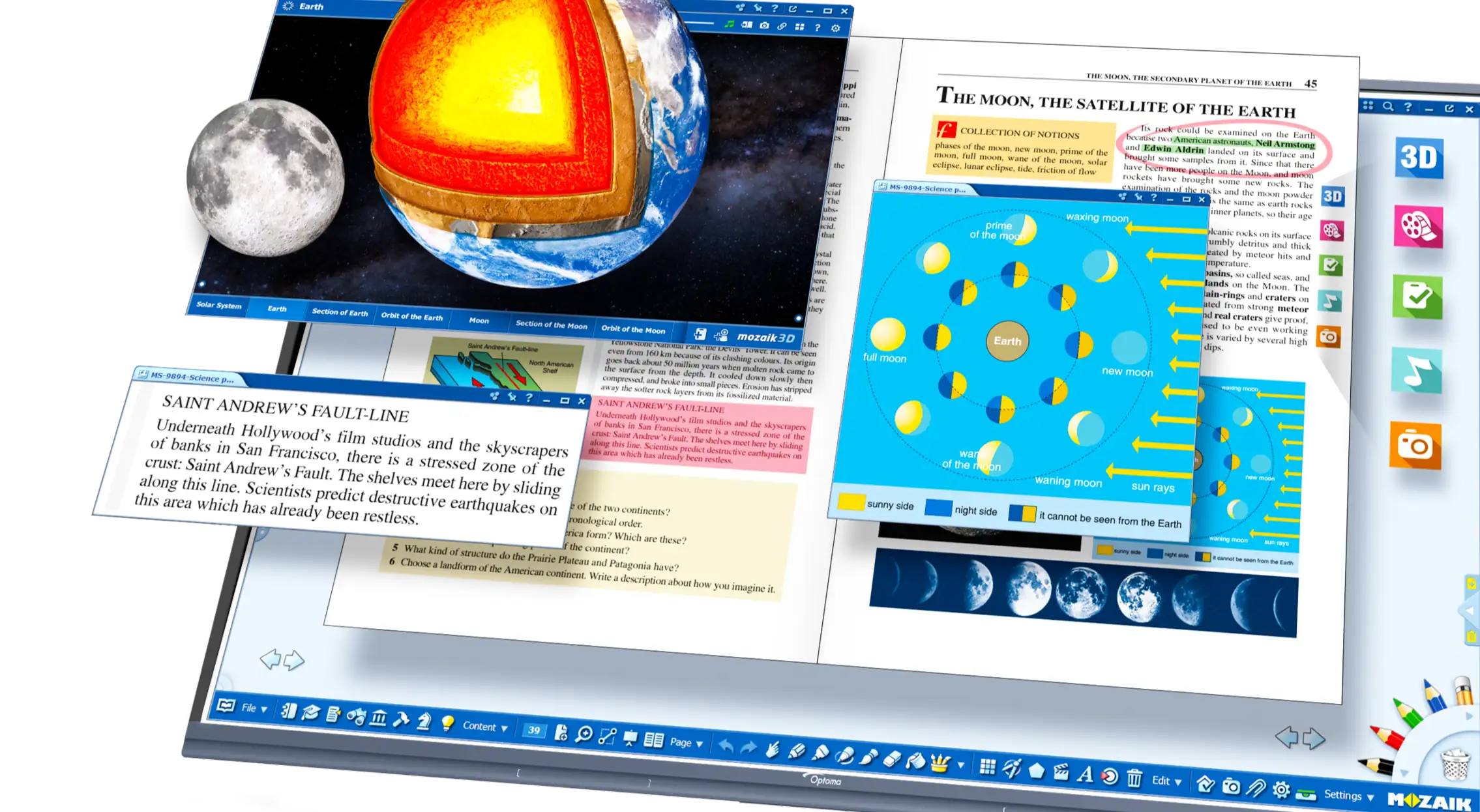 mozaBook est un logiciel de présentation conçu pour être utilisé sur les écrans interactifs en classe. Grâce à ce logiciel, les enseignants et les élèves peuvent créer des présentations et les enrichir d'animations 3D, de vidéos éducatives, d'images ou d'exercices provenant de la médiathèque ou de leurs propres fichiers. Le logiciel comprend une variété de ressources pédagogiques, telles que des applications thématiques, des jeux et des scènes 3D couvrant tous les sujets de la maternelle au lycée. Un logiciel qui permet de susciter l'intérêt des élèves et les aider à mieux comprendre les sujets.